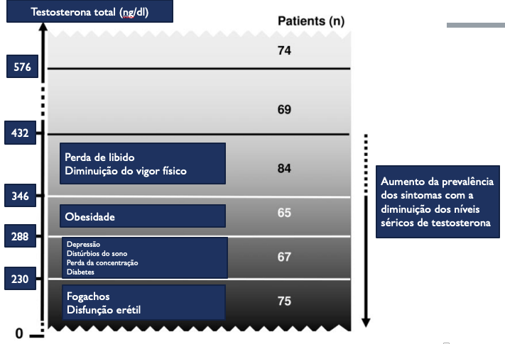 Você sabia que os sintomas de hipogonadismo (baixo nível de testosterona) podem variar de acordo com os níveis séricos desse hormônio. Na referência abaixo, o autor fez uma pesquisa das queixas dos homens e relacionou com os níveis hormonais. Um dos primeiros sintomas é a diminuição do desejo sexual, enquanto a disfunção erétil aparece nos níveis mais baixos.